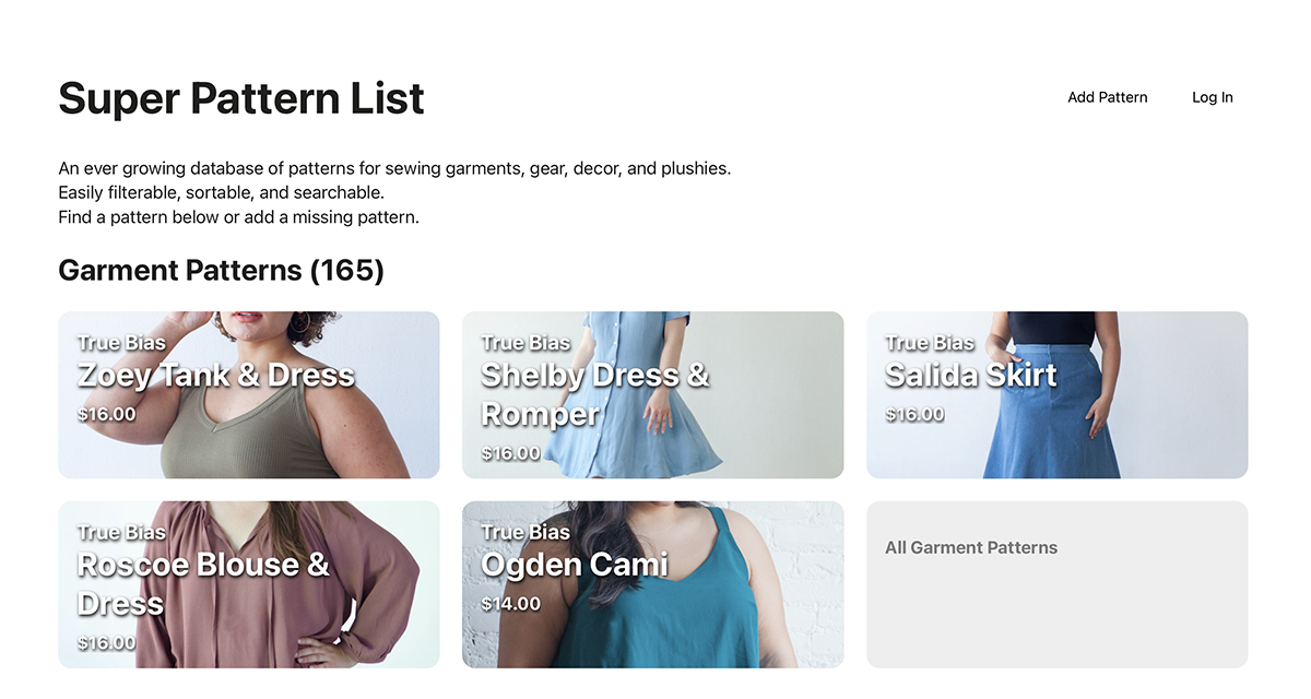 SuperPatternList is a constellation of applications built to find, host, and display sewing patterns. It is built in Javascript and Python using Node, Flask, MongoDB, React, and Flask-Login on AWS and Heroku.